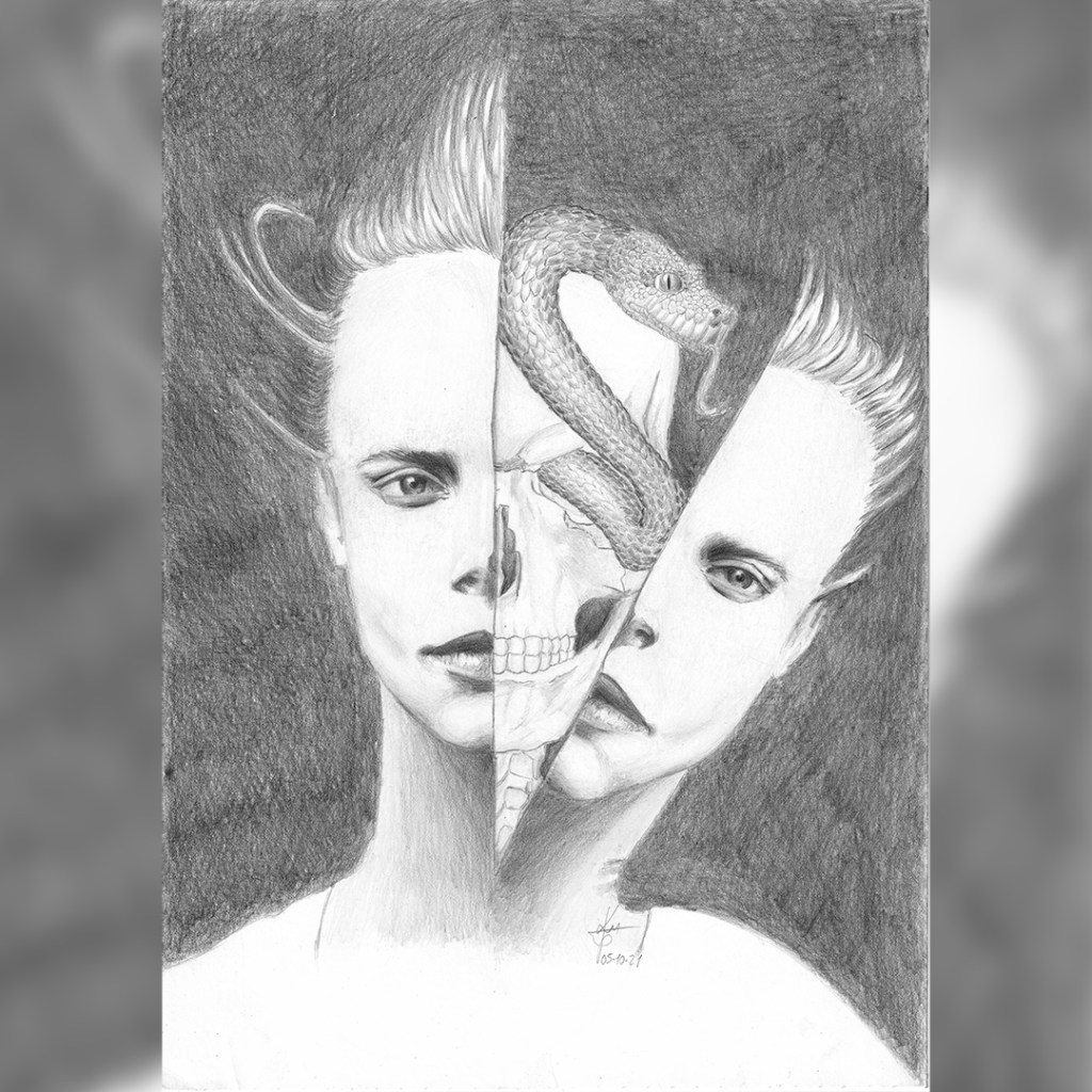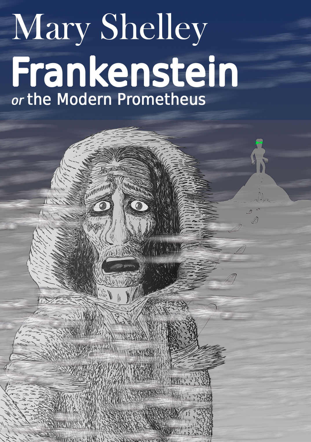 DEMO for a cover of the novel “Frankenstein” of Mary Shelley – ink on paper and digital coloring and processing.