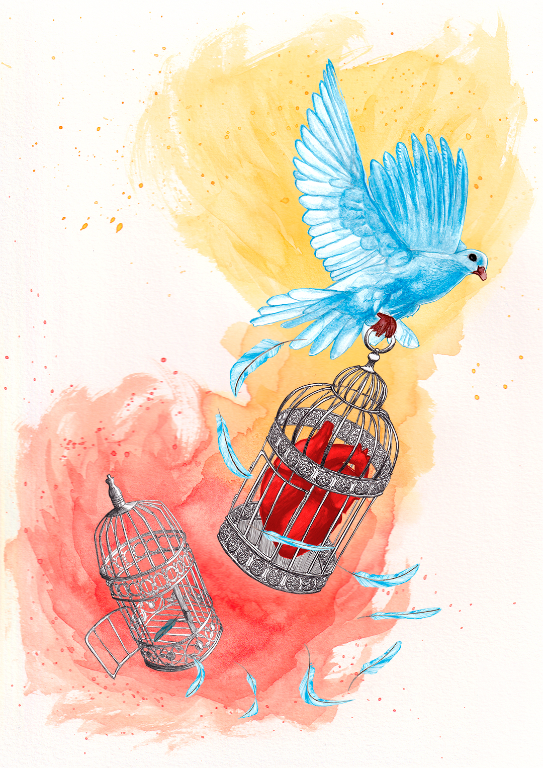 Illustration on a the theme “dove, heart, cage” – watercolor and ink on paper, digital processing.